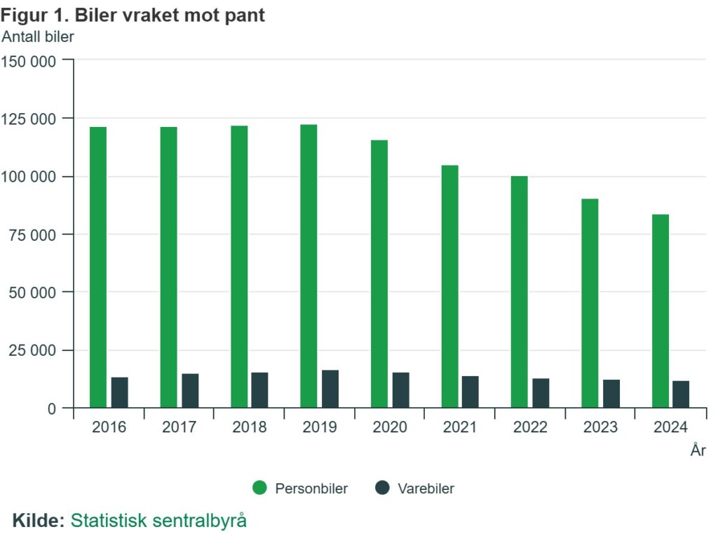 Fra 2019 har det vært en jevn nedgang i antall biler levert til vraking med pant. Totalt var nesten 96 000 biler vraket mot pant i 2024. Av dette utgjorde personbiler i underkant av 84 000, mens varebiler utgjorde rundt 12 000. I 2024 var nedgangen i biler vraket mot pant på 6,8 prosent sammenlignet med 2023. Nedgangen er tydeligere for personbiler enn for varebiler, med henholdsvis 8 prosent og 1 prosent.