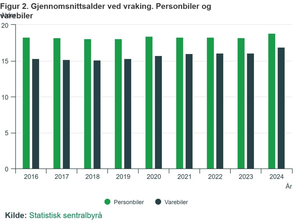 Gjennomsnittsalderen for bilene som blir vraket er 18,8 år for personbiler og 16,9 år for varebiler i 2024. Det er en økning i gjennomsnittsalderen fra 2023 til 2024 for både personbiler og varebiler med henholdsvis 0,6 og 0,8 år. Dette viser at nordmenn i 2024 leverer litt eldre biler til vraking enn i tidligere år.