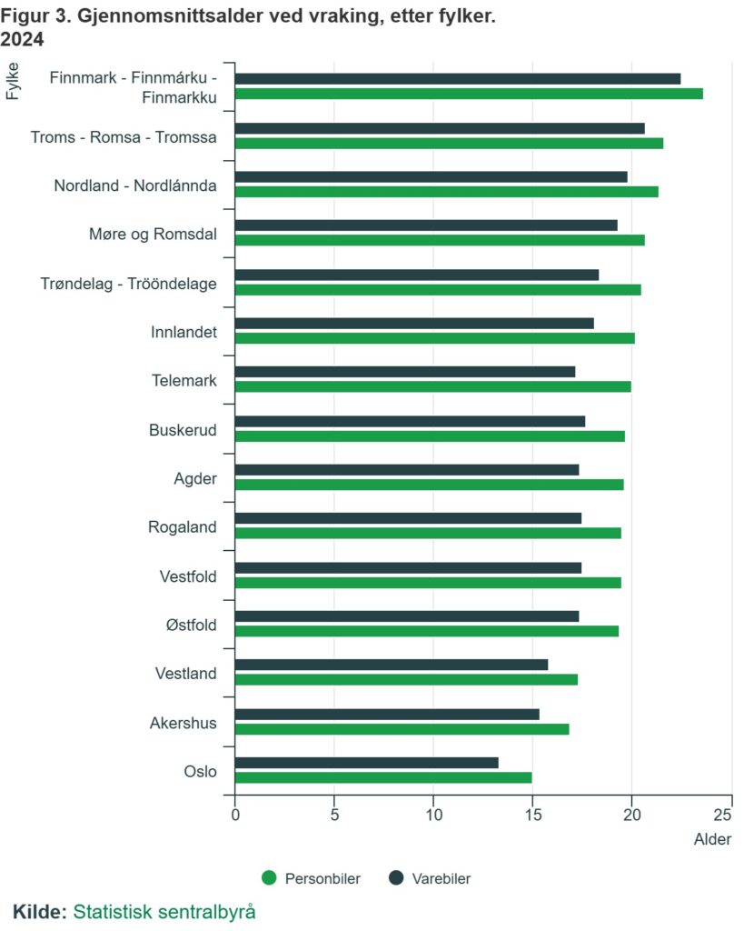 Fylket med lavest gjennomsnittsalder ved vraking i 2024 er Oslo med 15 år for personbiler og 13,3 år for varebiler. Fylket med høyest gjennomsnittsalder ved vraking er Finnmark med 23,6 år for personbiler og 22,5 år for varebiler.
