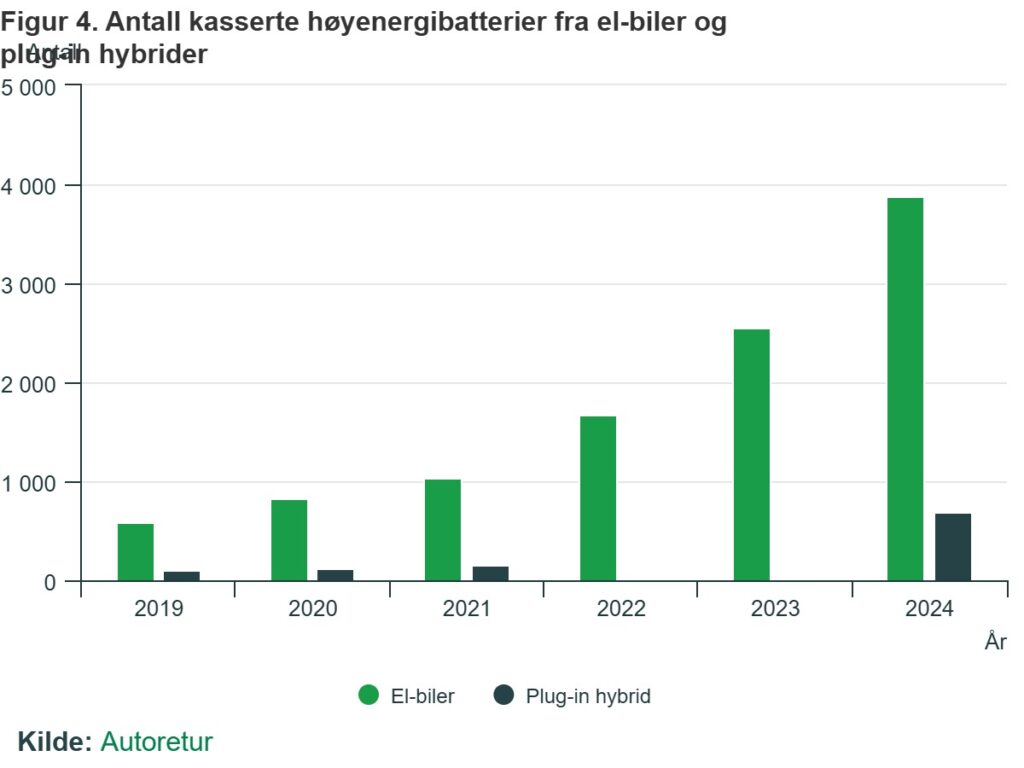 Bilparken i Norge har hatt en stor vekst i antall el-biler og plug-in hybrider på veiene. Men hva skjer med kjøretøyene når de når slutten av sin levetid? I 2024 ble det kassert 4 570 høyenergibatterier fra el-biler og plug-in hybrider, en økning på 79,4 prosent sammenlignet med 2023.