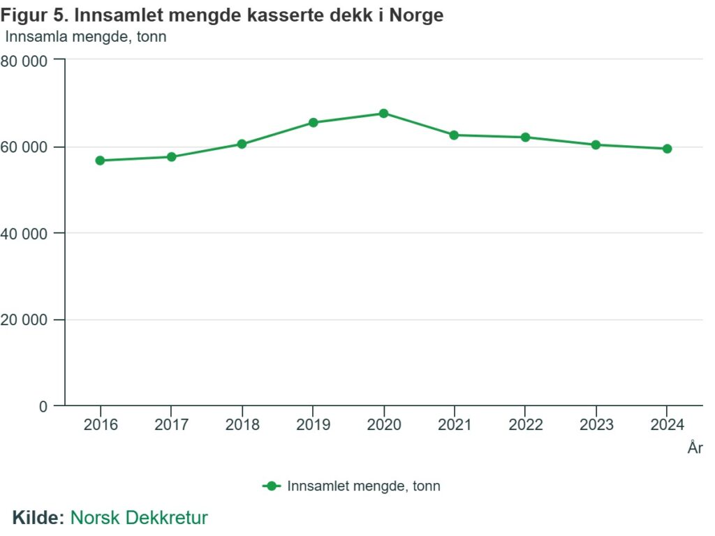 Fra toppåret 2020 har det vært en årlig nedgang i mengden kasserte dekk som er samlet inn. I 2024 ble det samlet inn nesten 60 000 tonn, en nedgang på 12,1 prosent sammenlignet med 2020. Sammenlignet med 2023 var nedgangen i 2024 på 1,5 prosent. Det fylket med høyest innsamlet mengde kasserte dekk i 2024 er Innlandet med 7 151 tonn, og lavest innsamlet mengde er Finnmark med 1 340 tonn. Totalt ble 54 409 tonn av de innsamlede dekkene gjenvunnet i 2024, som vil tilsi en gjenvinningsgrad på 91,7 prosent. Av dekkene som ble gjenvunnet gikk 69 prosent til energigjenvinning og 31 prosent til materialgjenvinning.