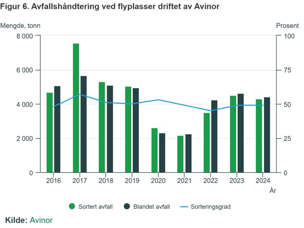 I 2024 var den totale avfallsmengden på alle Avinors flyplasser på 8 700 tonn, hvor cirka 4 300 var sortert avfall, og de resterende 4 400 tonn var restavfall. Dette gir en sorteringsgrad på 49 prosent. Sammenligner man avfallsnivået i 2024 med avfallsnivået i 2019 – året før Covid-19 pandemien, ser man en reduksjon i avfallsnivået på 12,6 prosent. Sorteringsgraden har falt med 1 prosent i samme periode. Dette viser at samtidig som avfallsnivået har blitt redusert på flyplassene, har sorteringsgraden holdt seg stabil på rundt 50 prosent.